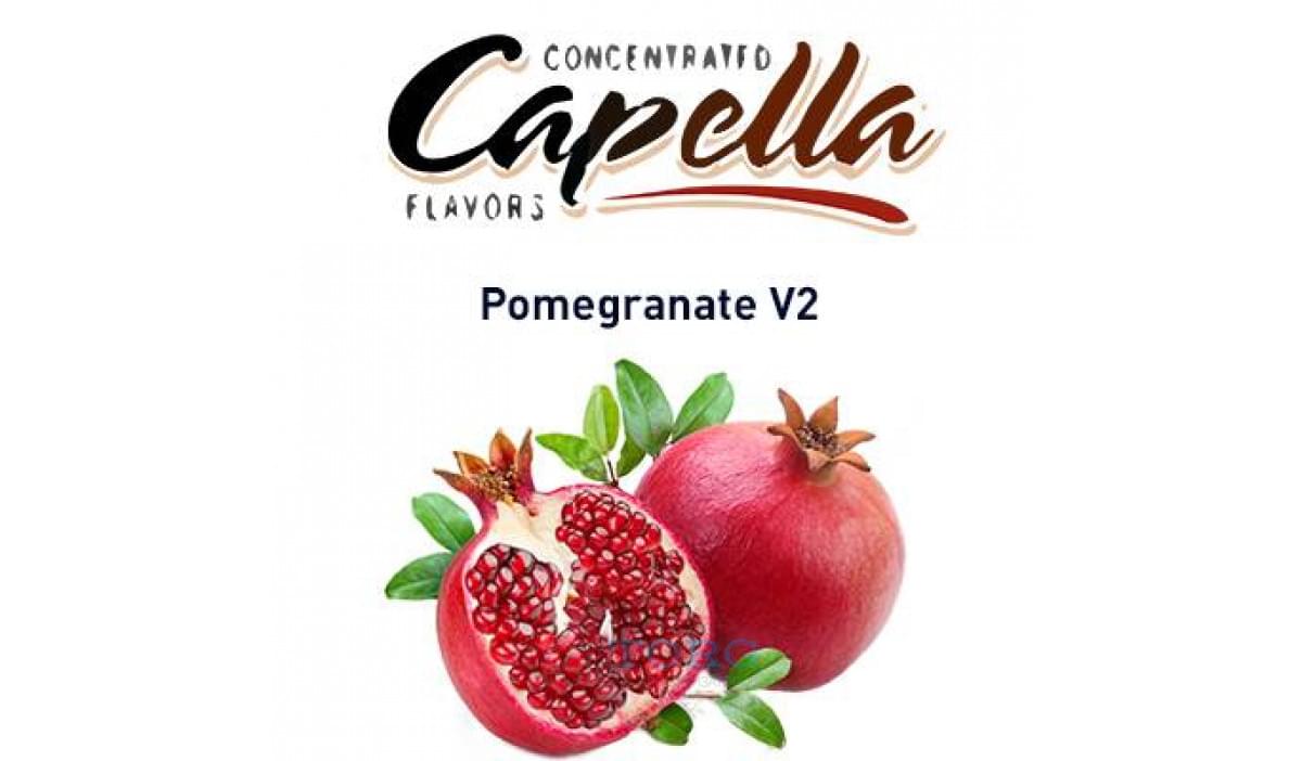Качественный ароматизатор со вкусом граната, рекомендуемый . Эта арома относится к серии V2 и не содержит эфирных веществ. В составе: эссенции, лимонная кислота, а также спирт. Продукт отличается кисло-сладким вкусом, очень реалистично повторяющим спелый гранат. Рекомендуется употреблять Pomegranate V2 Capella в пропорции 5% в соло и до 3-4% в рецептах.